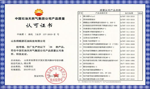 公司建立了先進完善的內控體系和質量控制體系,通過了API spec Q1及API 13A認證、ISO9001質量管理體系認證、14001環(huán)境體系認證、18001職業安全健康體系認證、HSE健康安全環(huán)保體系認證和CNPC油田化學劑質量認證。